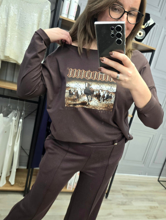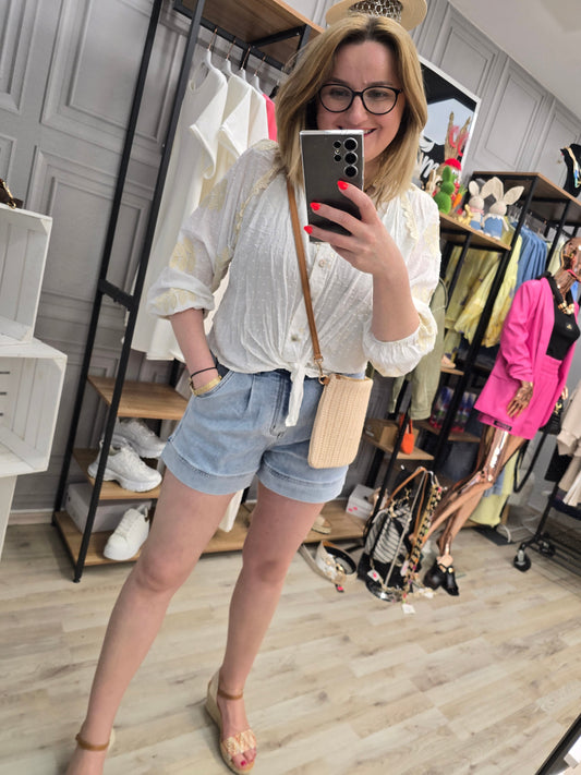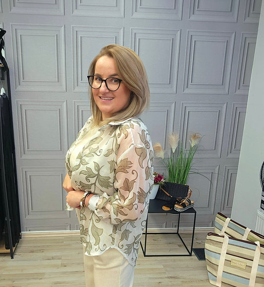 Sommer Anzug Bluse und Marlene Hose Creme - Muster grau